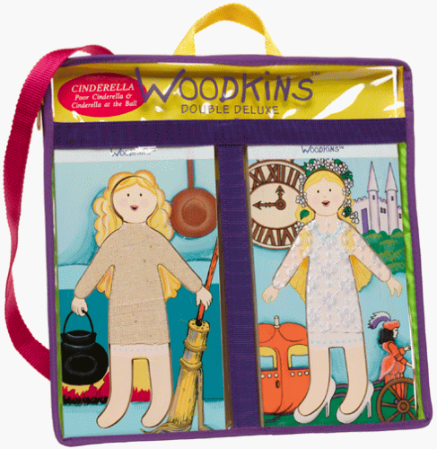 Junior fashion designers will enjoy the unique concept of Woodkins sets--part paper doll and part dress-design kit The Cinderella set includes two dolls poor Cinderella and Cinderella at the ball The dolls are flat 8-inch-tall wooden shapes attached to a wooden frame with a painted background Read More..