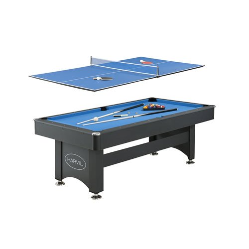 The versatile Harvil 7 Foot Pool Table with Table Tennis Top includes everything you need to play pool or table tennis The thick non-slate billiard table features red felt and black plastic drop pockets while the blue two-piece ping pong top includes black edge trimming This game table features a Read More..